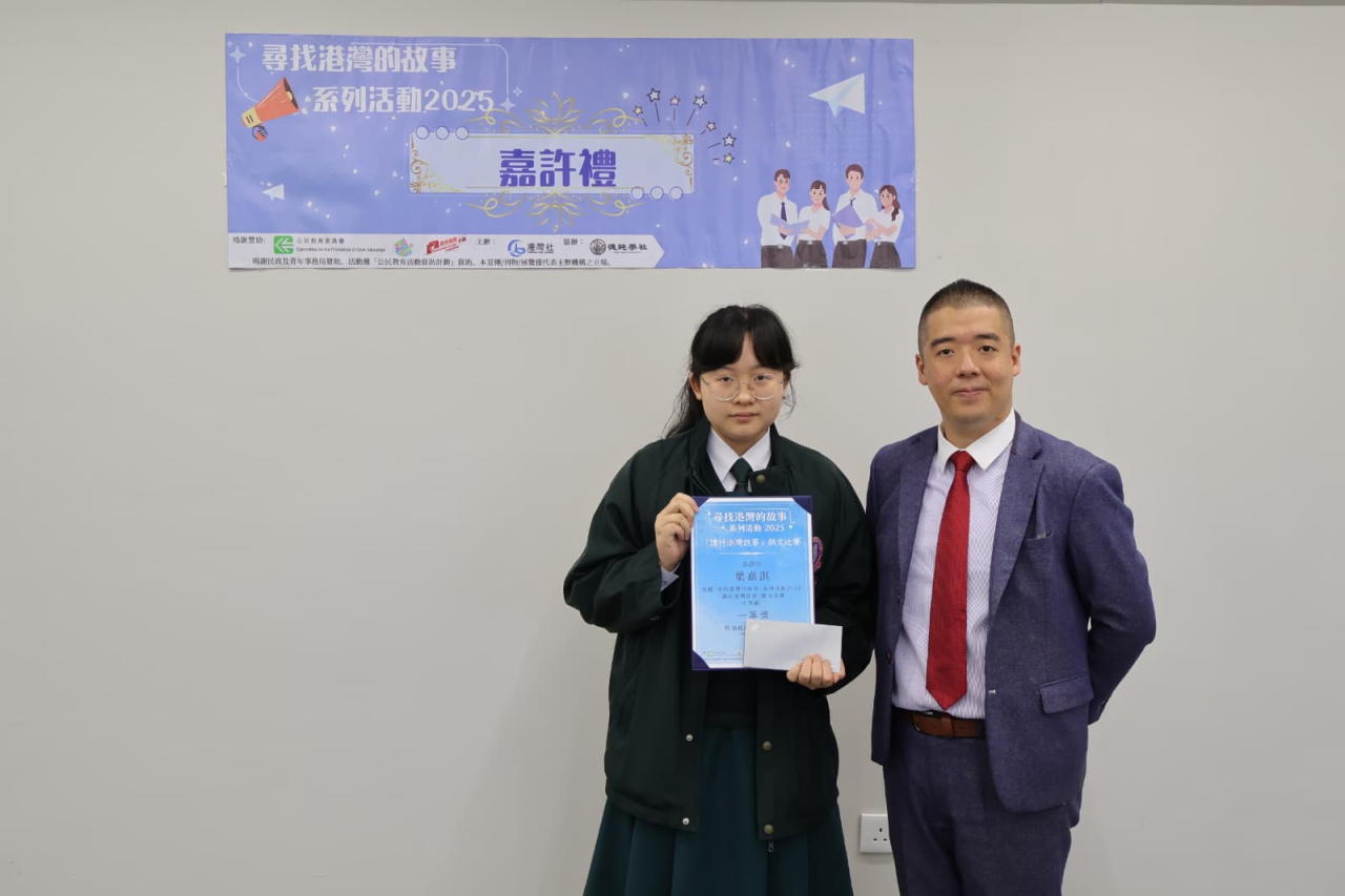 本校5B班葉嘉淇同學早前參加由「尋找港灣的故事」系列活動委員會主辦的2025年度「講好港灣故事」徵文比賽。是次比賽吸引全港多間中學學生參與,葉同學作品〈細說大灣非遺〉內容切合主題,文字表達清晰,對大灣區文化有深入的觀察與思考,獲評審肯定,最終榮獲中學組一等獎。