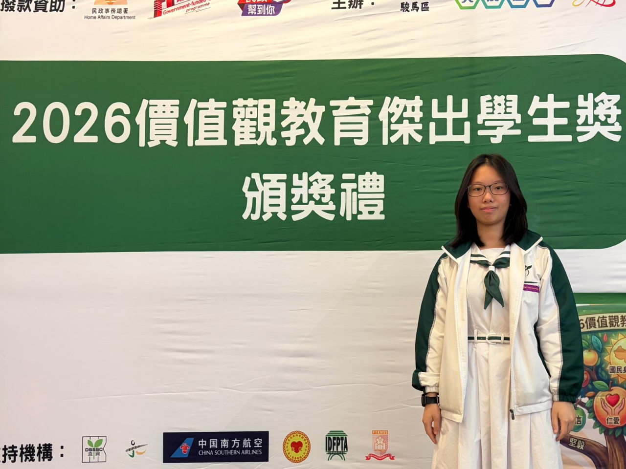 本校5A柳美瑾參與由「香港價值觀教育教師協會」主辦、民政事務總署協辦的2026年價值觀教育傑出學生選舉並獲選為傑出學生。為鼓勵學校積極推動價值觀教育,表揚在教育局十二項核心價值觀中表現傑出的學生,樹立傑出學生成為學習榜樣,主辦方邀請獲獎學生出席於3月21日舉行的頒獎典禮。