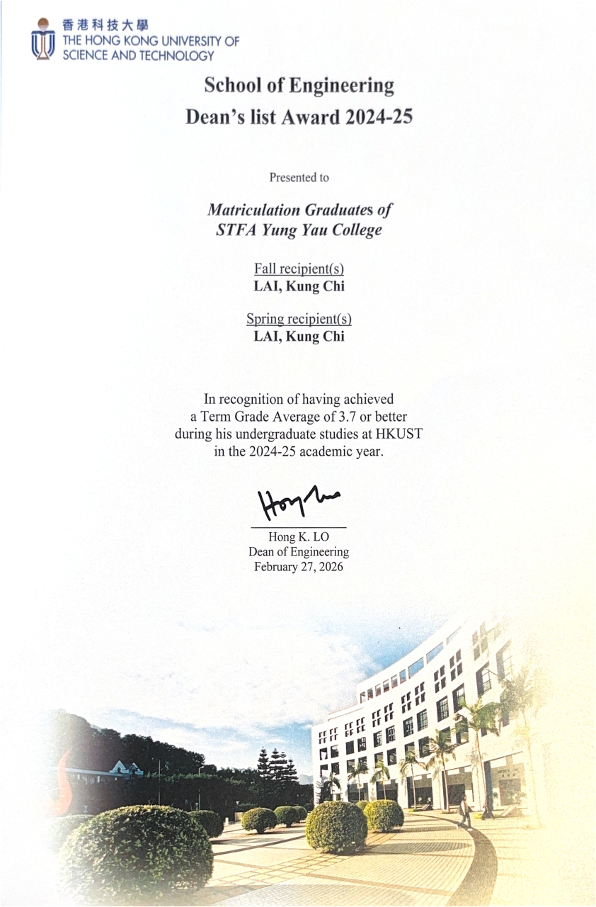 恭喜本校畢業生,賴栱智獲香港科技大學頒發「工程學系院長嘉許名單」( Dean List )以茲鼓勵於學系內學期成績達最高5%的同學。同學已經連續兩年獲得該等殊榮,實在可喜可賀。