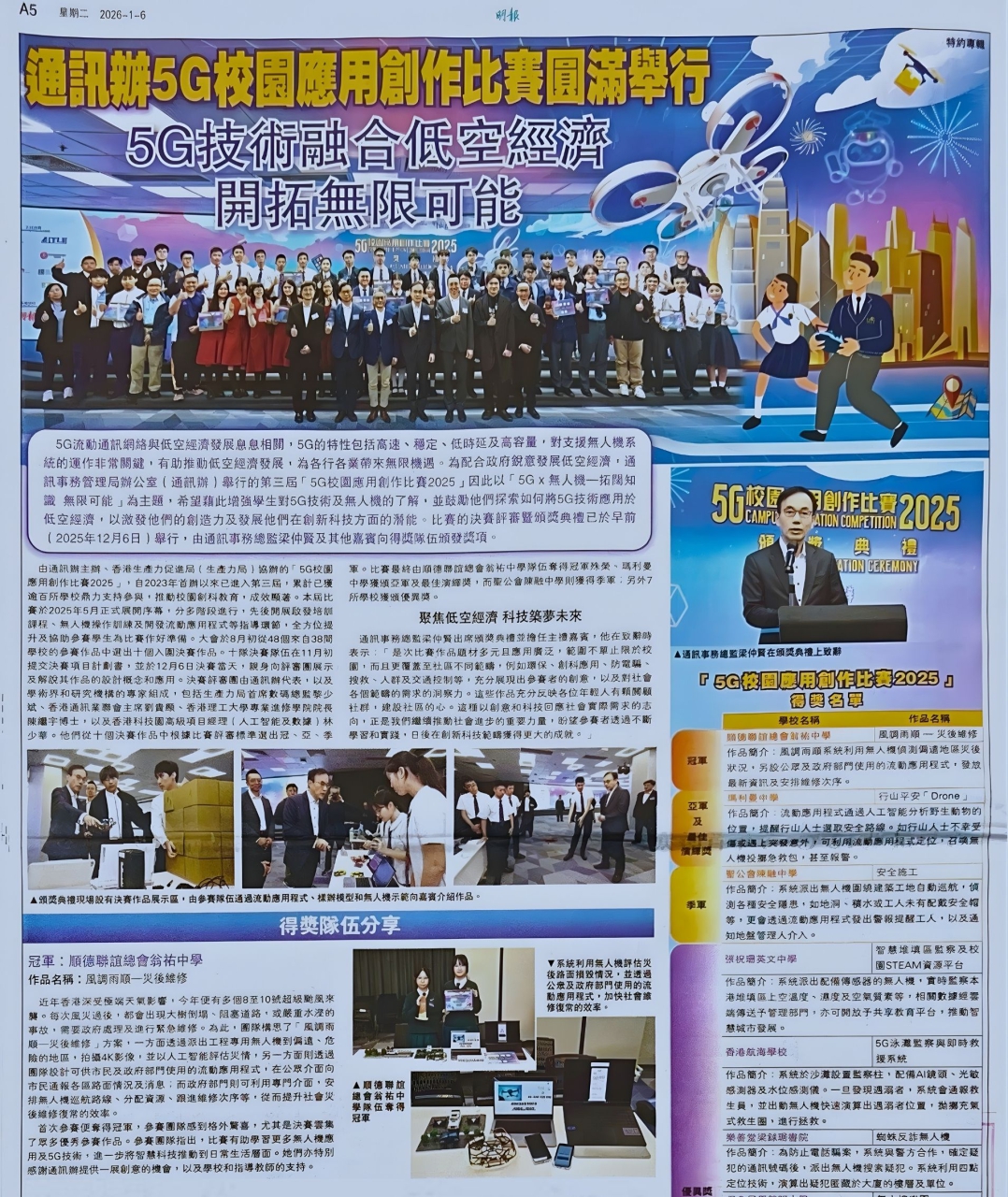 l 《明報》(2026 年 1 月 6 日):「《通訊辦 5G 校園應用創作比賽圓滿舉行 5G 技術融合低空經濟 開拓無限可能》」