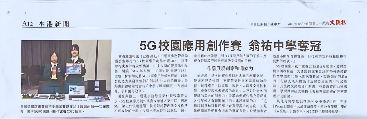 l 《香港文匯報》(2025 年 12 月 9 日):「5G 校園應用創作賽 翁祐中學奪冠」