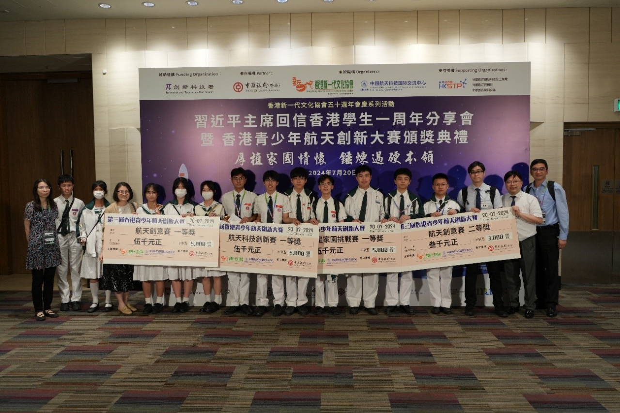 早前,本校同學組隊參加由香港新一代文化協會、中國航天科技國際交流中心舉辦;支持機構為特區政府教育局、特區政府創新科技及工業局、中聯辦教育科技部;夥伴機構為中國銀行(香港);由香港大學、香港中文大學、香港科技大學、香港理工大學、香港城市大學、香港浸會大學、香港恒生大學、香港都會大學共同協辦的香港青少年航天創新大賽。頒獎典禮於2024年7月20日假香港科學園大展覽廳舉行,主禮嘉賓包括香港特別行政區行政長官李家超先生,中央人民政府駐香港特別行政區聯絡辦公室主任鄭雁雄先生,中央人民政府駐香港特別行政區聯絡辦公室副主任盧新寧女士,香港特區政府教育局局長蔡若蓮博士(JP),前立法會主席曾鈺成先生(GBM,GBS,JP),中國銀行(香港)副總裁兼風險總監徐海峰先生,新一代文化協會主席翁建霖教授,新一代文化協會總幹事蘇芷祺博士(BBS,MH,JP),及創新科技及工業局副局長張曼莉女士。