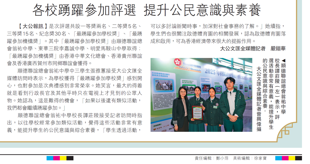 最踴躍參加學校獎(全港3名) | 順德聯誼總會翁祐中學 |