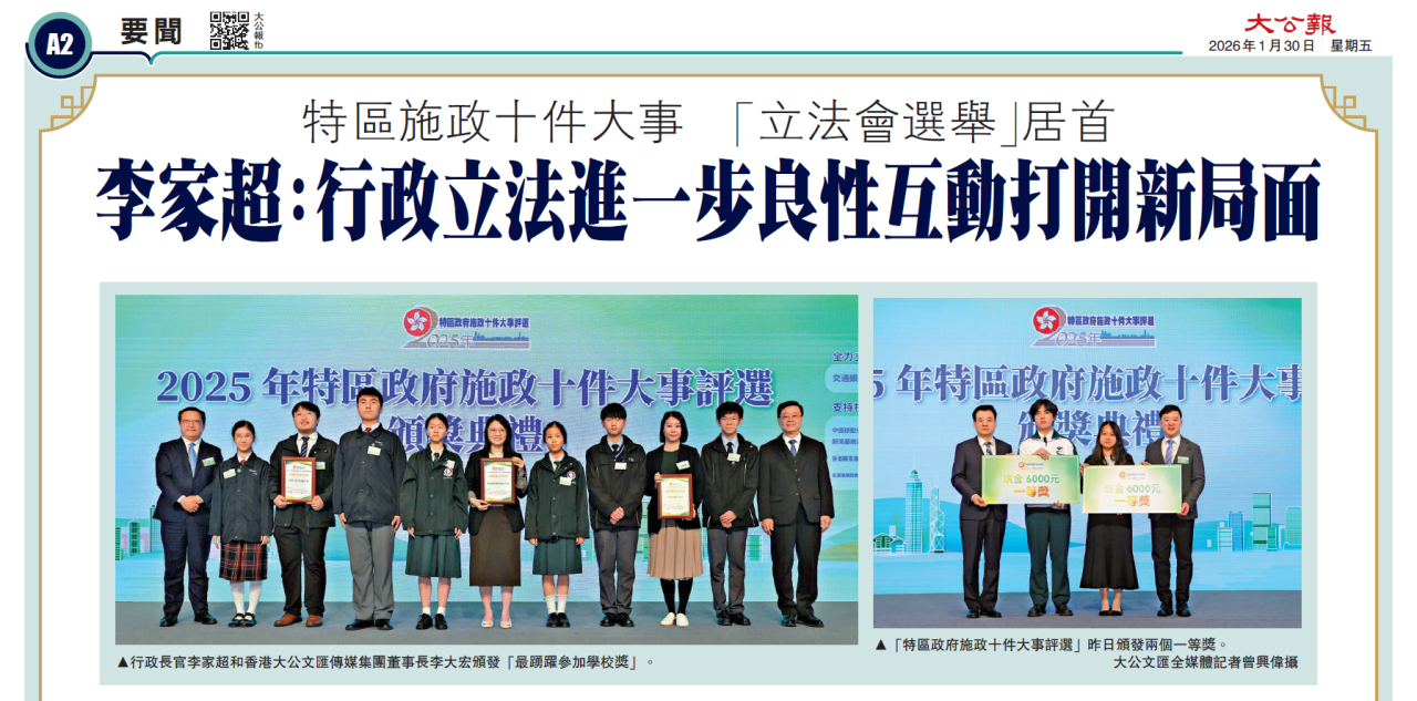 本校參加第二十七屆「特區政府施政十件大事評選」活動,本校榮獲合共十個獎項。頒獎典禮已於1月29日下午4:00 假灣仔會展N101舉行,並由行政長官李家超先生親蒞主禮頒獎。 得獎詳情如下: